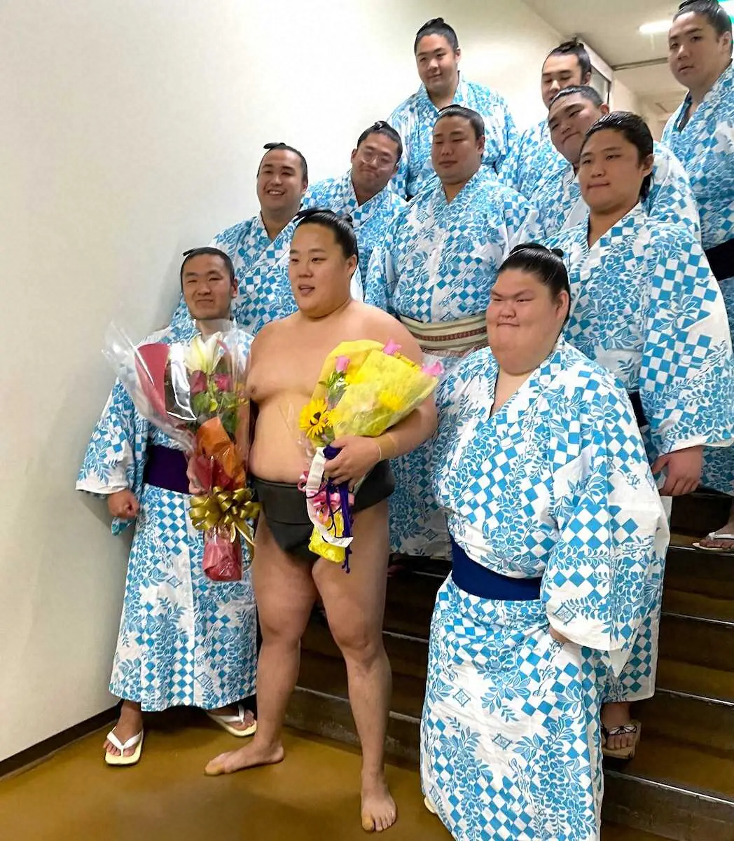 夏場所千秋楽、最後の取組を終えて部屋の力士たちと記念撮影に収まる荒馬(前列中央)