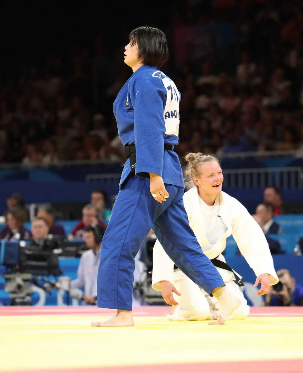 開始2分だった。得意の内股を狙い攻め続ける新添は、一瞬の隙を突かれ体落としで技ありを奪われた。その後も内股を警戒する相手に攻めあぐね、無念のタイムアップ。ファンデイケがスタンドに向け歓喜のガッツポーズを見せる中、新添は天を仰いだ。初戦から緊張した様子を見せていた昨季世界女王は、力を出し切る前に敗れた。畳を下りた後、悔しそうな表情を見せた新添。16年リオ五輪の田知本遥、21年東京五輪の新井千鶴に続くこの階級の日本勢3連覇はなくなったが、戦いはまだ終わっていない。意地の銅メダルへ、気持ちを切り替える。