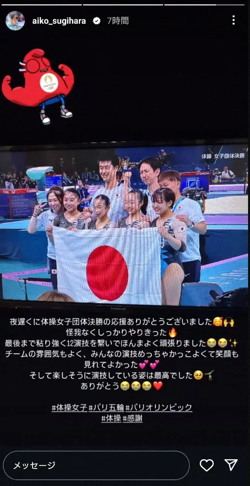 体操女子で16年リオデジャネイロ、21年東京と五輪2大会に連続出場した杉原愛子(24=TRyAS)が31日、自身のインスタグラムを更新。ストーリーズでパリ五輪代表メンバー4人の8位入賞を称えた。