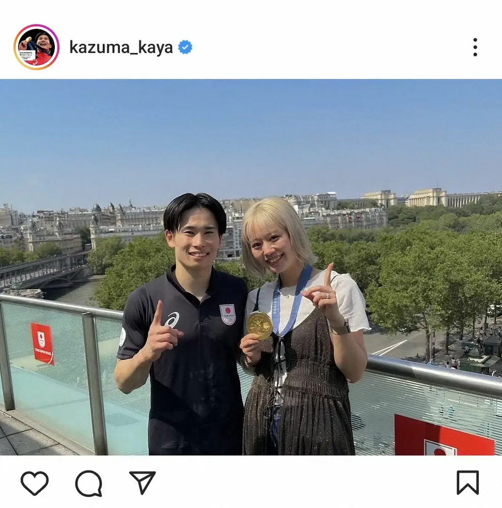 大逆転で16年リオデジャネイロ五輪以来となる団体で金メダルを獲得した男子体操・日本代表の主将、萱和磨(27=セントラルスポーツ)が31日、自身のインスタグラムを更新。妻・星良さんとの夫婦ショットを披露した。