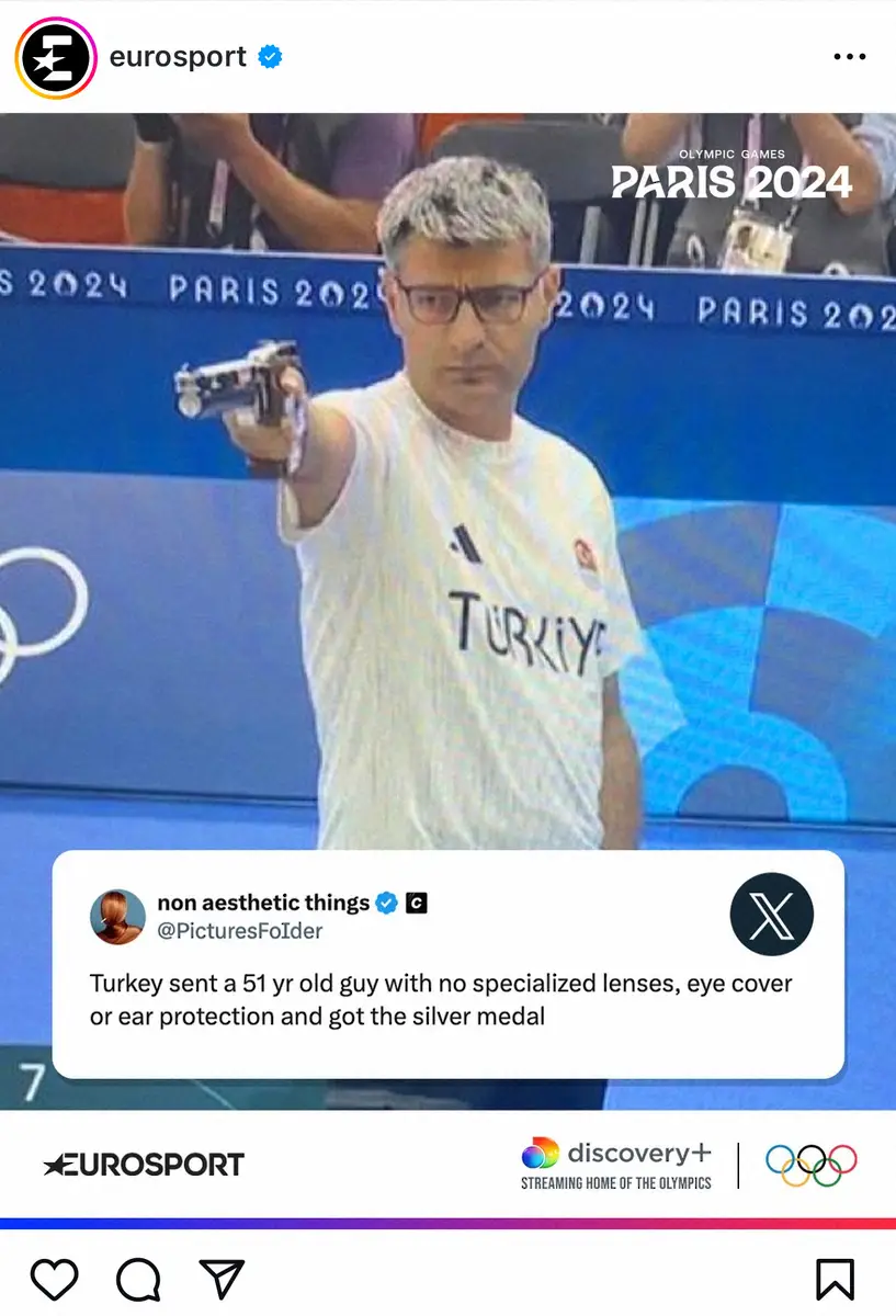 パリ五輪射撃の混合エアピストルで銀メダルに輝いたトルコ代表のユスフ・ディケチ(51)がネット上で話題となっている。