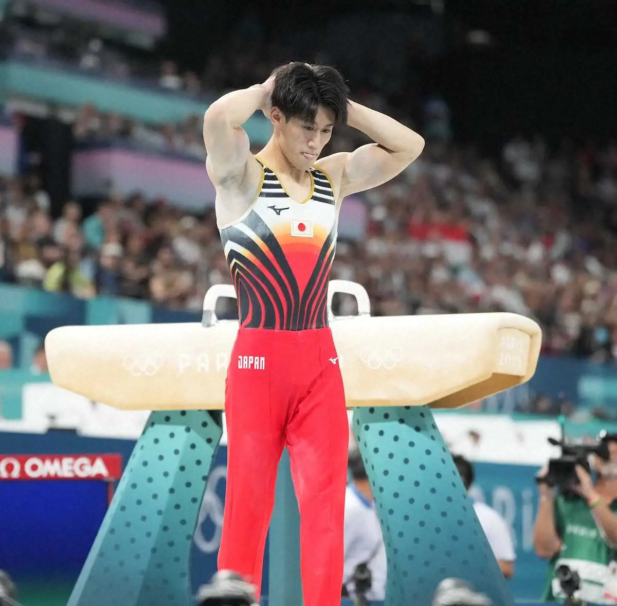 歓喜の金メダルを獲得した団体総合決勝から2日。団体で落下したあん馬が、この日も鬼門だった。倒立が乱れて再び落下し、頭を抱えた。