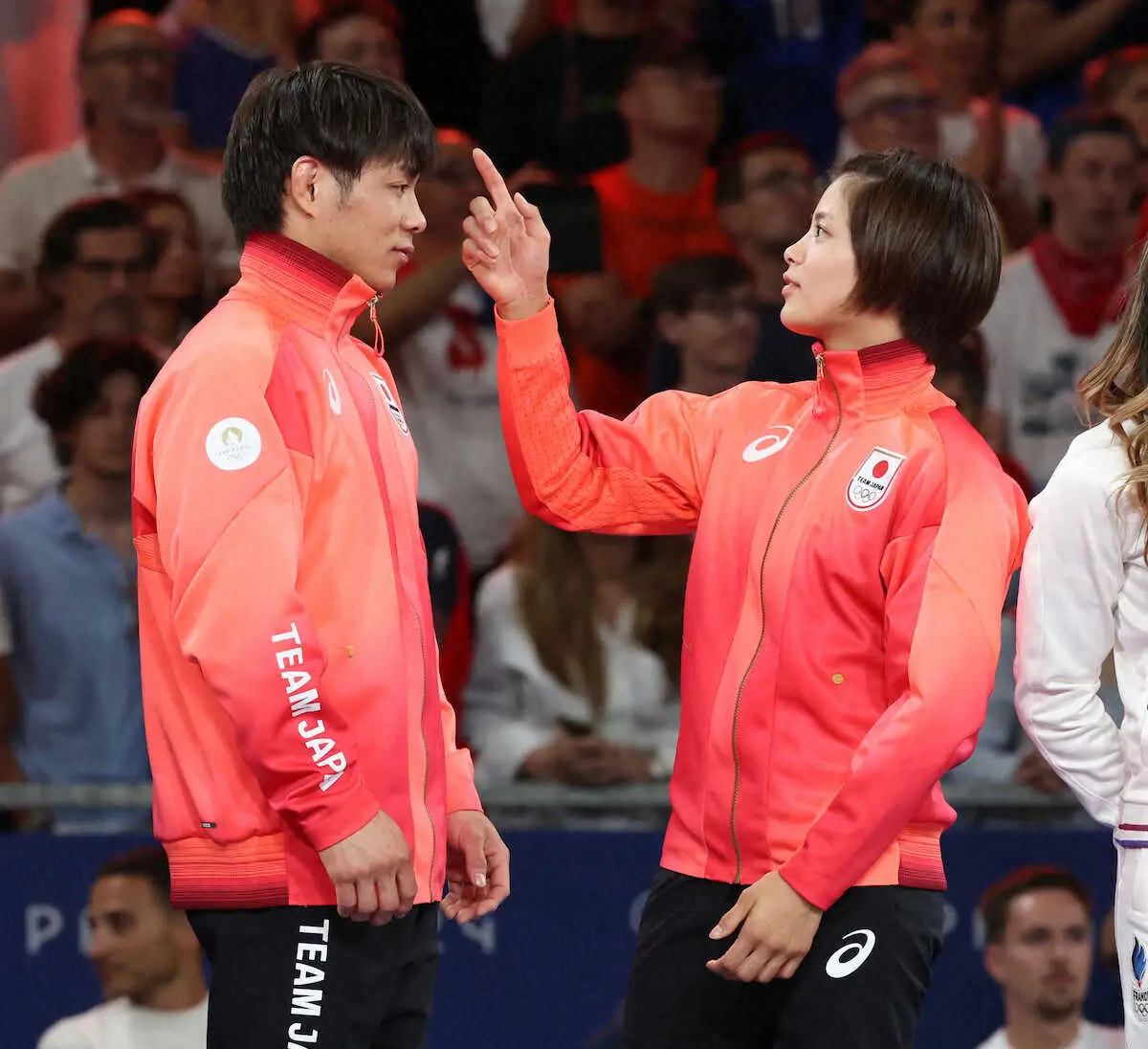 <パリ五輪 柔道>混合団体戦決勝、表彰式で談笑する阿部一二三(左)と阿部詩(撮影・平嶋 理子)