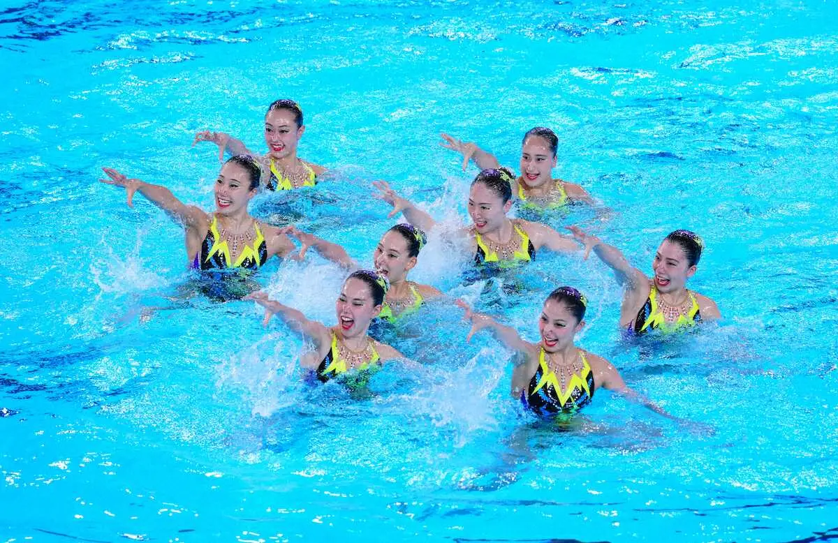 チーム・テクニカルルーティン(TR)が行われ、日本(比嘉、木島、小林、佐藤、島田、和田、安永、吉田)は284・9017点で3位発進した。全チームが競技を終えた時点では253・6617点で6位だったが、抗議が通って得点が大幅アップ。銅メダルを獲得した16年リオデジャネイロ五輪以来2大会ぶりの表彰台へ好スタートを切った。6日にフリーフーティン(FR)、7日にアクロバティックルーティン(AR)を行い、三つのルーティンの合計点でメダルを争う。