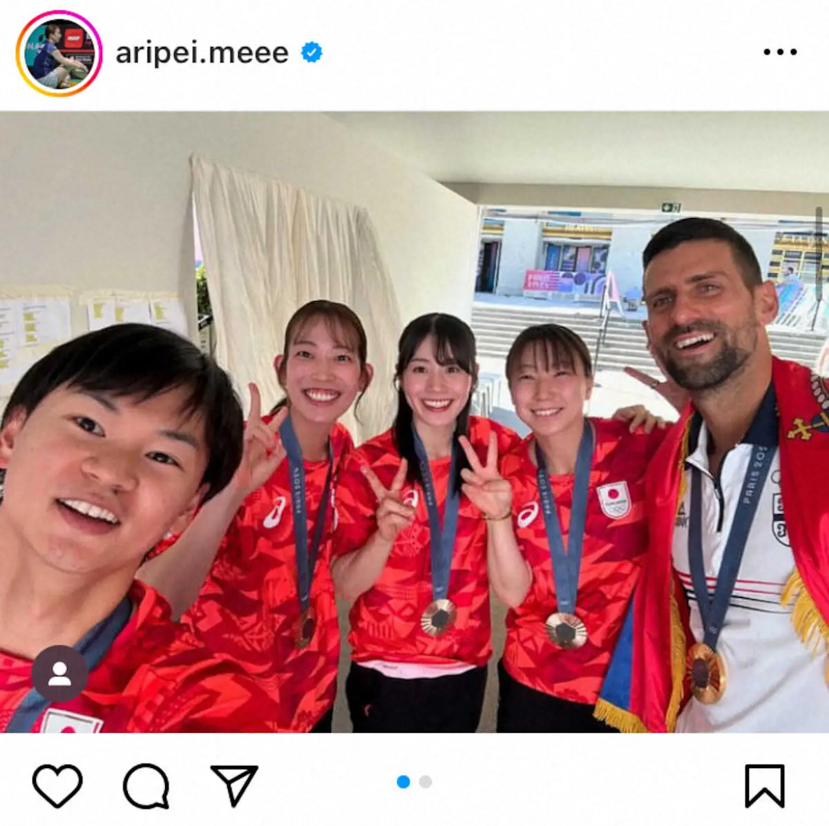 東野は「ジョコビッチ様」と投稿し、ある写真を掲載。それは混合ダブルスのパートナー・渡辺勇大に、女子ダブルス銅メダルの志田千陽、松山奈未を加えた4人と、テニス・男子シングルスで優勝したノバク・ジョコビッチとの記念撮影を掲載した。