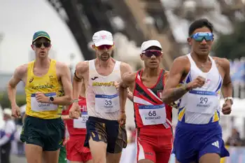 男女1人ずつがペアを組み、男子(11.195キロ)―女子(10キロ)―男子(11キロ)―女子(10キロ)の順で42.195キロをリレーする混合団体。競歩特有の「歩型違反」は通算3度目でペナルティーゾーンに3分間ストップする罰則を受けるが、優勝争いの中で犯してしまったのが中国。3位につけていた3区の賀相紅が3度目で3分間のストップを強いられ、9位へ後退した。