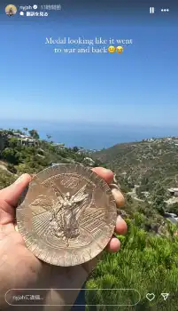 ヒューストンはストーリーズで「戦争に行って戻ってきたみたいなメダル」「メダルはケースに入れるものだと思う」と銅メダルの画像をアップ。裏面の塗装がボロボロになっている様子を伝えた。