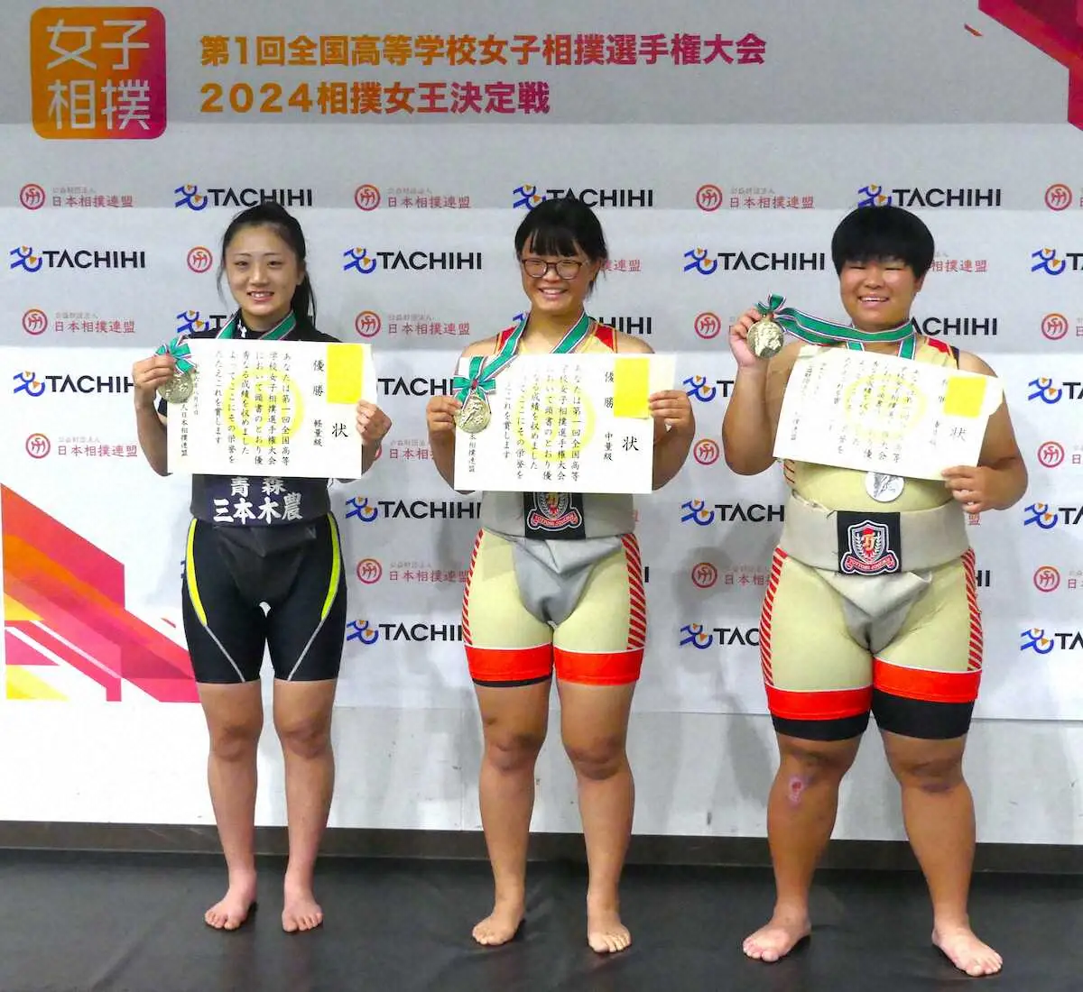 第1回全国高等学校女子相撲選手権大会が10日、東京都立川市のアリーナ立川立飛で開催された。軽量級(60キロ未満)、中量級(75キロ未満)、重量級(75キロ以上)の3階級に分かれた個人戦と、3人制の団体戦が行われ、高校日本一を懸けて計40人の選手が熱戦を展開した。