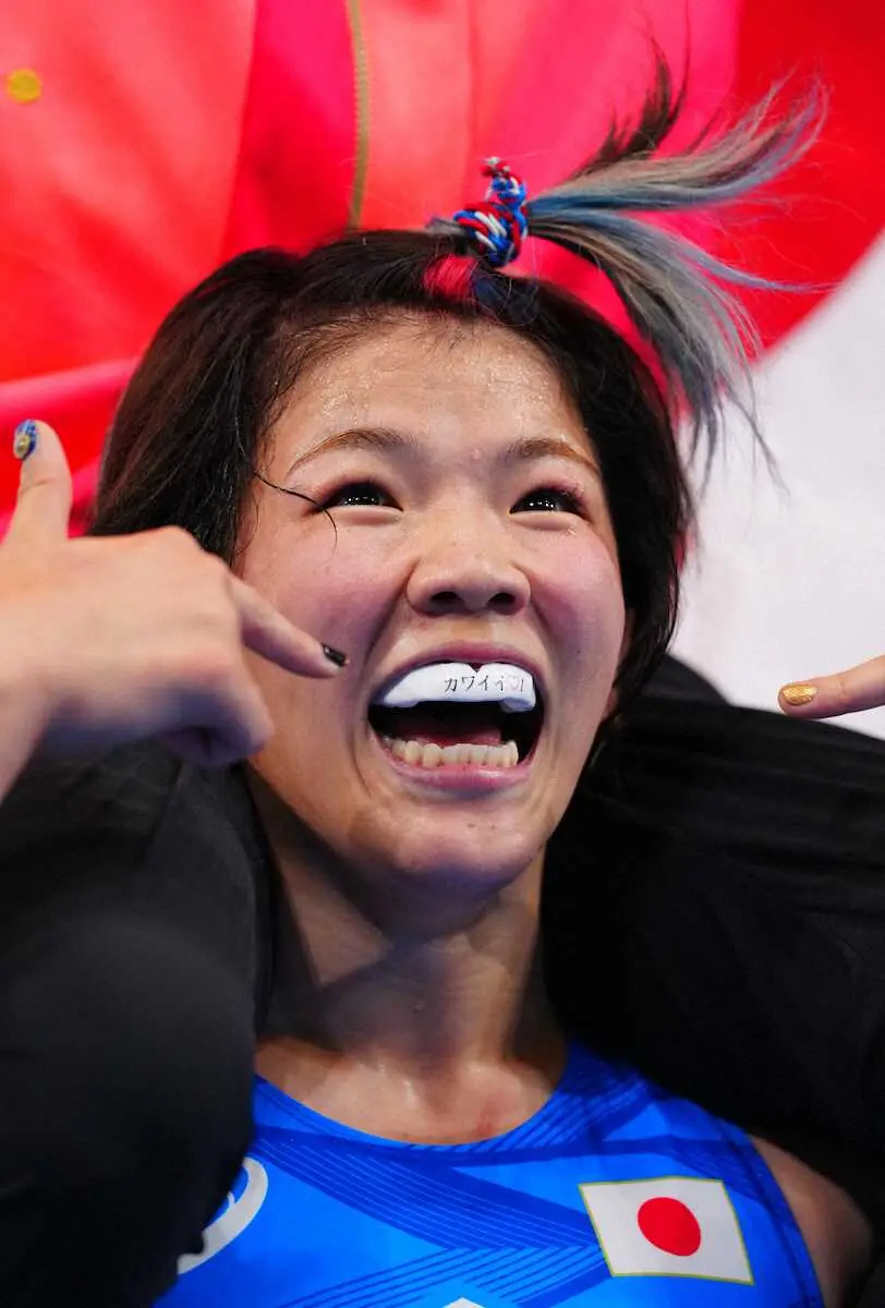 笑顔はじける金メダル。前田コーチを担ぎ上げ日の丸を掲げ歓喜のウイニングラン。最後はコーチをマットに投げ捨て会場を沸かせた。吉田沙保里を彷ふつさせる肩車も披露。その後、スタンドの両親や兄と喜びを分かち合い、仲間とハイタッチを交わし、最後に藤波が下りてくると2人で号泣。約束の金メダルをつかんだ2人は、強く強く抱きしめ合い泣き続けた。
