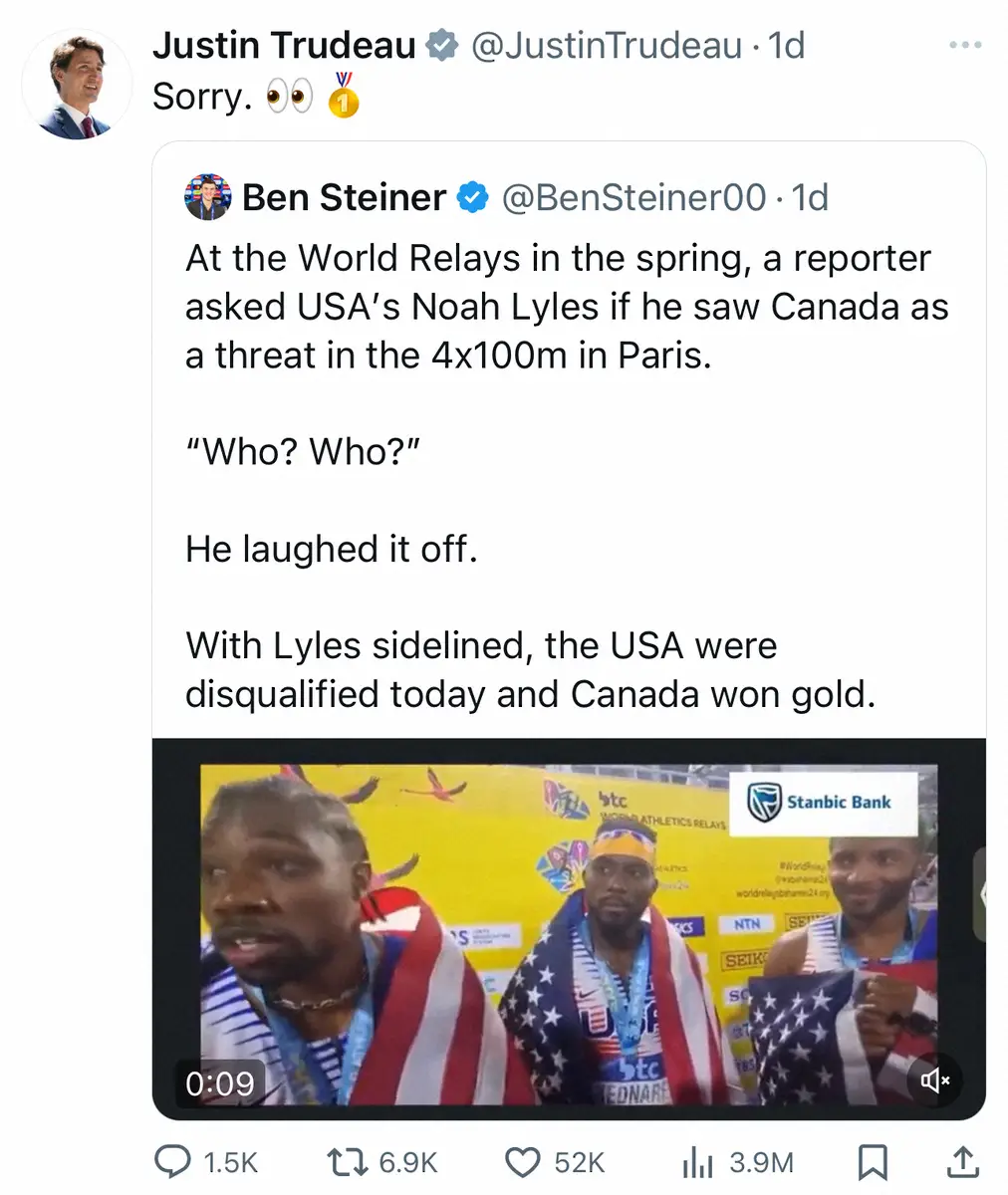 カナダ代表がパリ五輪男子400メートルリレー決勝で金メダルを獲得した後、トルドー首相は自身のXでこの動画を引用。「ごめんね」という一言とともに金メダルの絵文字で皮肉った。