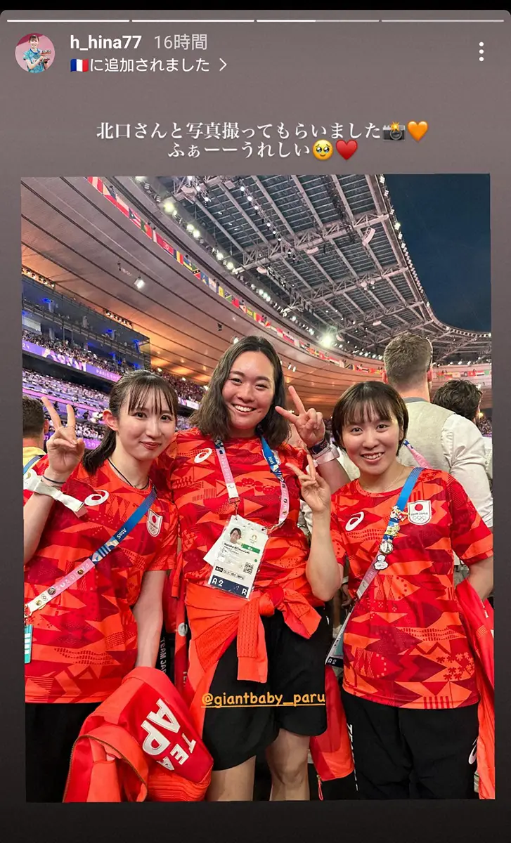 パリ五輪女子卓球シングルスで銅、団体で銀メダルを獲得した早田ひな(24=日本生命)が12日までに自身のインスタグラムのストーリーズを更新。閉会式で一緒に写真を撮ったアスリートに感激した様子を明かした。
