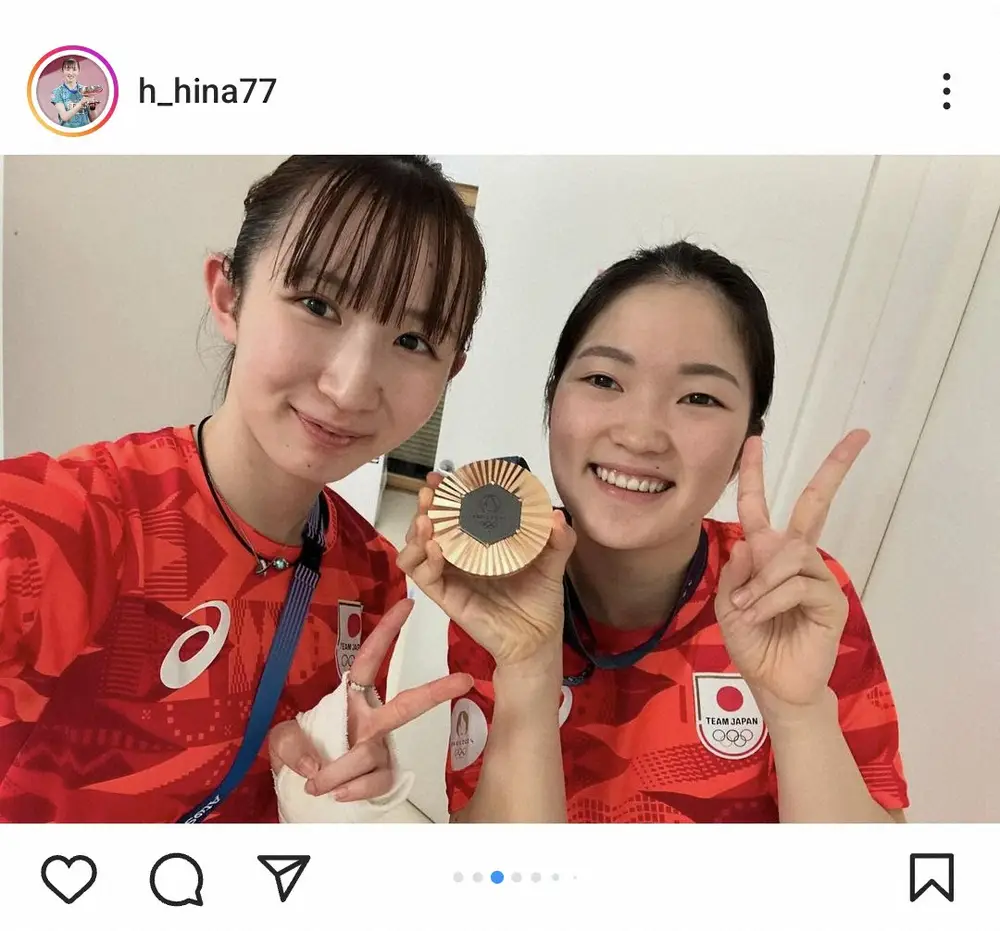 パリ五輪女子卓球シングルスで銅、団体で銀メダルを獲得した早田ひな(24=日本生命)が13日、自身のインスタグラムを更新。大会でリザーブとして帯同した木原美悠(20=木下グループ)への感謝を記した。