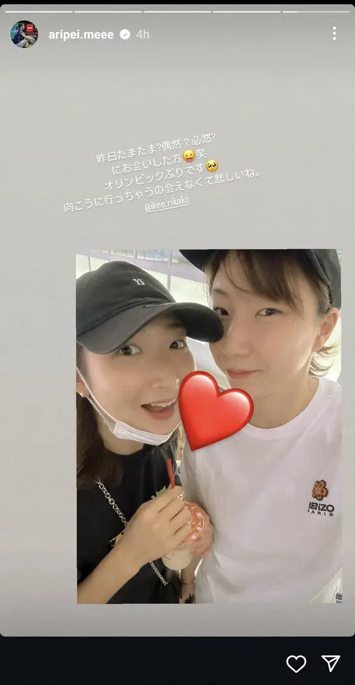 ストーリーに「昨日たまたま?偶然?必然?にお会いした方笑」と書き出すと、黒のTシャツにキャップ姿の池江と、白のTシャツに黒のキャップ姿の自身が寄り添うショットをアップ。