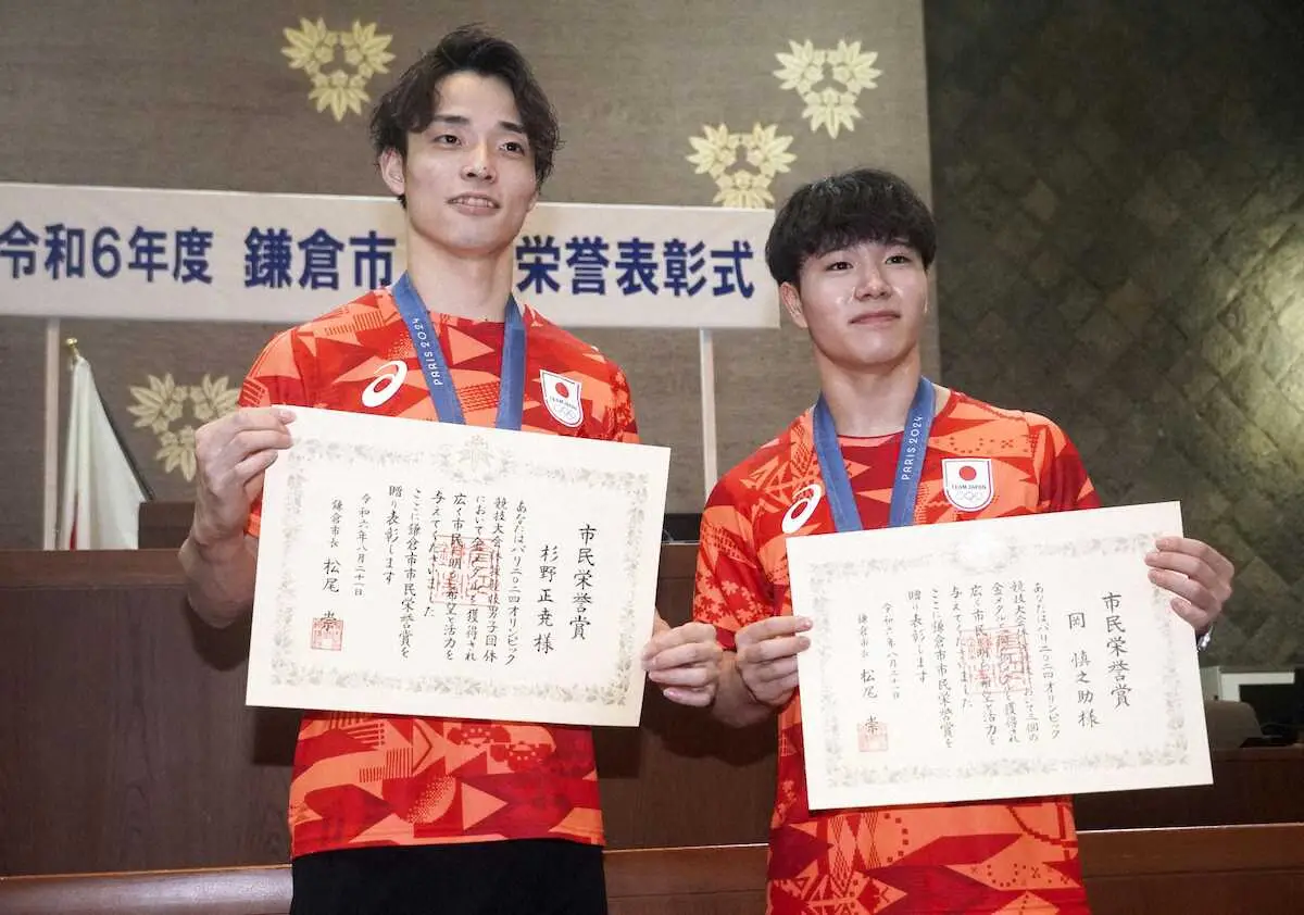 パリ五輪の体操男子で3冠に輝いた岡慎之助(20)と団体総合で金メダルを獲得した杉野正尭(25=ともに徳洲会)が21日、神奈川県鎌倉市から市民栄誉賞を贈られた。