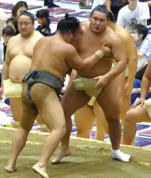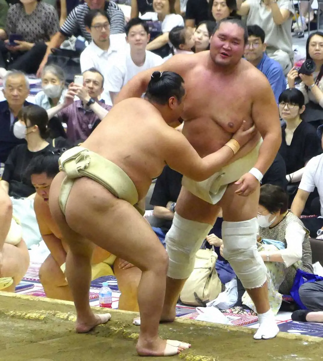最初は右足を前に出して残していたが、3本目の時にバランスを崩して土俵下へ転落。4本目からは左足を前に出して踏ん張り足を変え、重い腰で残す場面も見せた。左膝に違和感があったのか、その後は少し足を引きずるような動きが見られた。