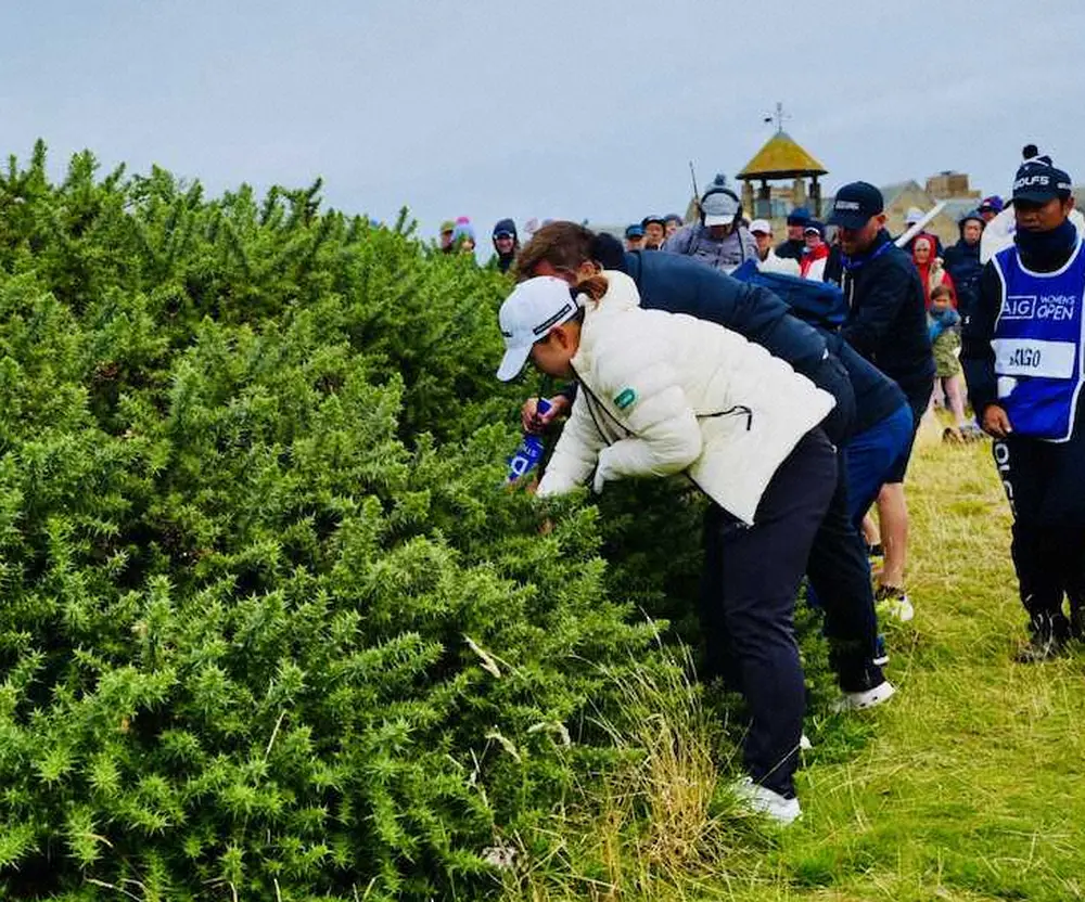 <全英女子オープン2024最終日>2番、ティーショットでブッシュに打ち込んだボールを探す西郷真央(中央)(撮影・会津 智海)