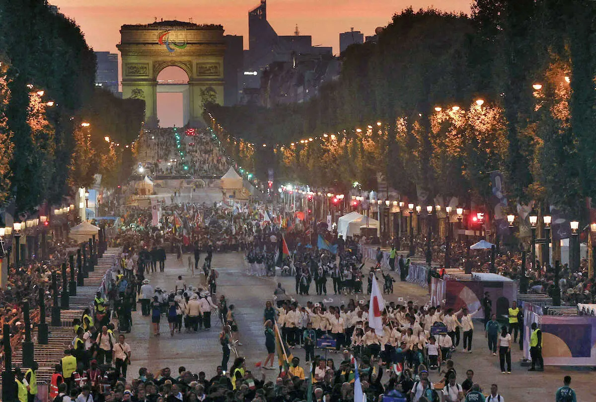 五輪を3度開催しているパリが、1960年大会を第1回とするパラリンピックを迎えるのは初めて。開会式で選手団はシャンゼリゼ通りを行進して入場し、スローガンの「広く開かれた大会に」を印象づけた。海外開催の大会で最多の175選手が出場する日本は陸上男子の石山大輝(24=順大大学院)と競泳女子の西田杏(27=シロ)が旗手を務めた。