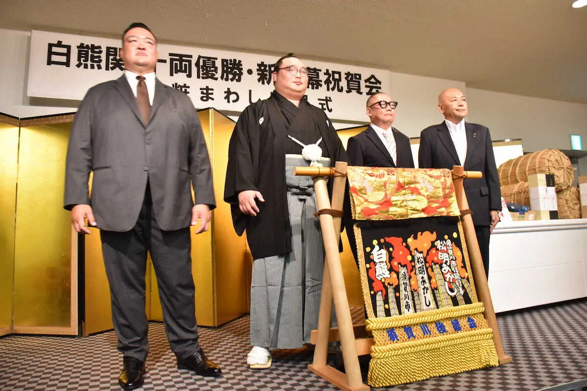 大相撲の人気力士、白熊(25=二所ノ関部屋)の「十両優勝・新入幕祝賀会・化粧まわし贈呈式」が31日、出身地の福島県須賀川市で開催された。