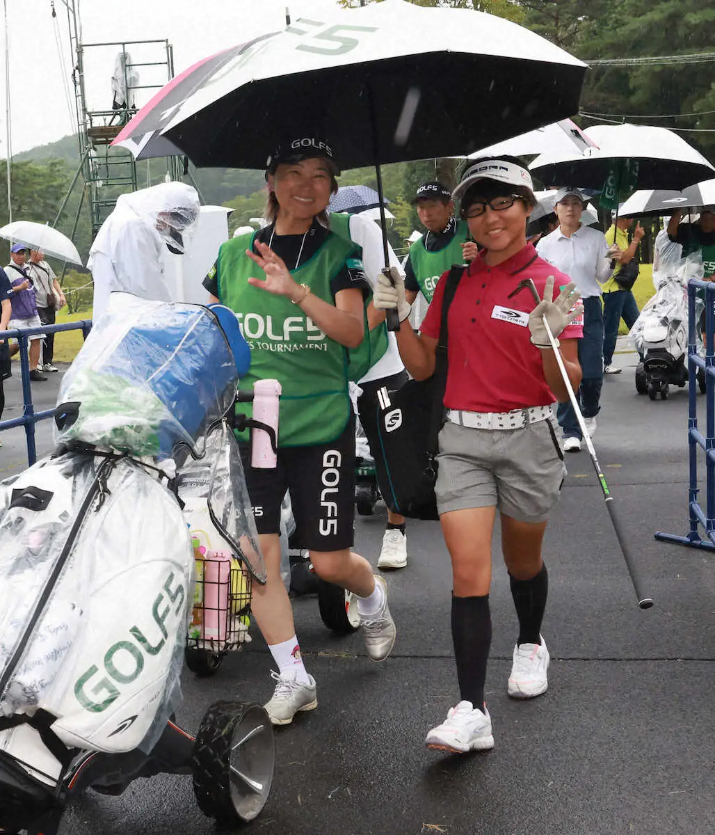 多くの観客が雨の中、クラブハウスの外で競技再開を待つ中、人の輪の中心にいたのがツアーデビュー2戦目を迎えた「ゴルフ天才少女」の須藤弥勒(13=ゴルフ5/太陽自動車)だった。