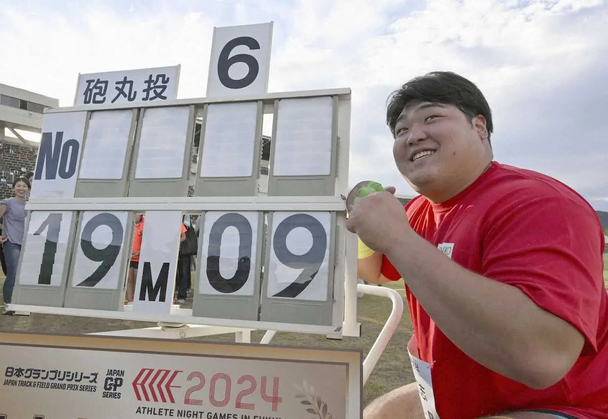 男子砲丸投げの奥村は地元福井県開催の大会で快挙を達成した。優勝を決めて迎えた最終6投目。思い切りよく放った砲丸は日本勢で初めて19メートルを超え、大歓声に包まれた。「今年はずっとこの大会で投げようと思ってやってきた。最高です」と声を弾ませた。相撲にも取り組んでいた中学で砲丸投げを始めた。3年時に全中を制するなど頭角を現し、国士舘大などを経て日本選手権は初制覇の23年から2連覇中。世界記録とは4メートル以上差がある種目だが「これからもコツコツ努力して頑張っていきたい」と決意を新たにした。