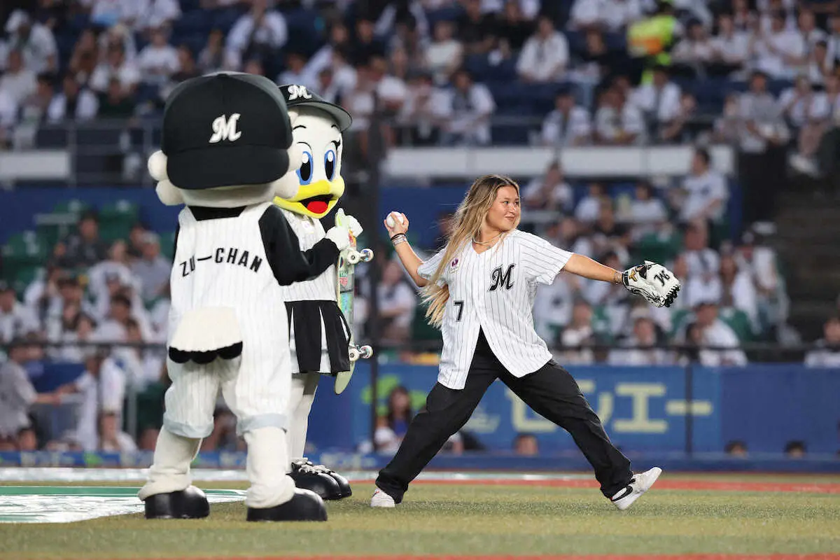 あいにくの雨模様となったが、スカイ・ブラウンはスケードボードを手に、誕生日(7月7日)にちなんで背番号7のユニホームで登場。打者・藤原、捕手・和田に対して投じたボールは大きく右に外れたが、スタンドのファンから大きな拍手が送られると、笑顔で手を振って応えた。