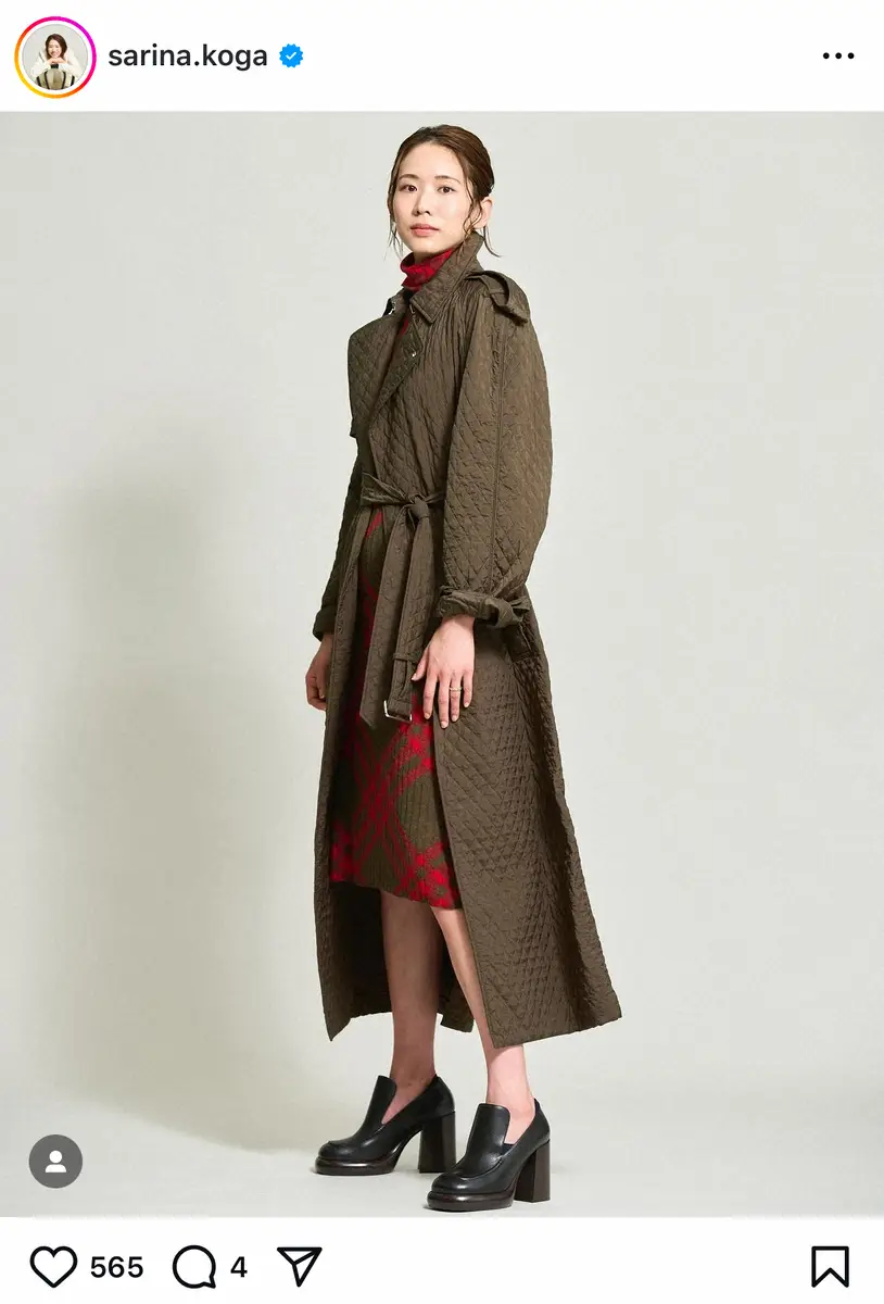 古賀さんは「この衣装が1番普段着ない感じだったので新鮮でした!!#burberryさんありがとうございました」とし英人気ブランド「バーバリー」の代名詞・チェック柄の洋服にカーキのキルティングコートを身にまとった自身の写真をアップ。