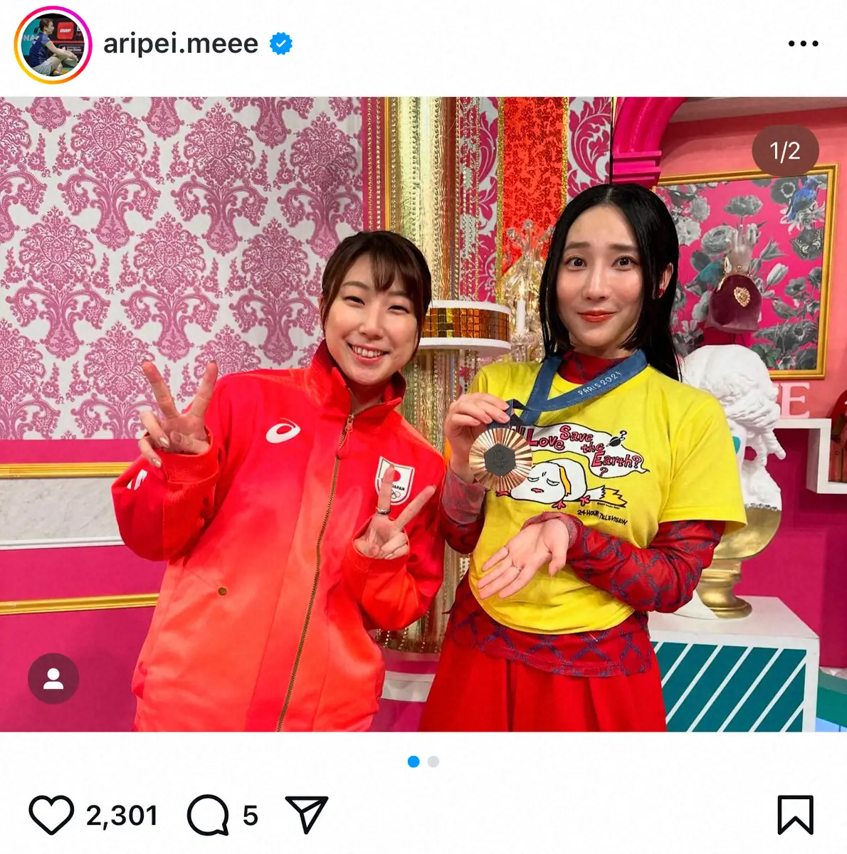 投稿では「24時間テレビ47『上田と女とオリンピアンが吠えるア~ンドやす子を応援する夜』に出演させていただきました!」と31日から放送されている24時間テレビ内の同コーナーに参加したことを報告。