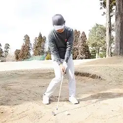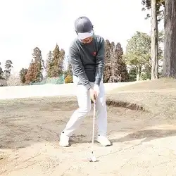 バックスイングでは手首のコックは使いません。手首のコックを使うと、ダウンスイングでクラブが鋭角に下りてきて、ヘッドが砂の中に深く潜ってしまうからです。バックスイングでは体の回転を意識しましょう。