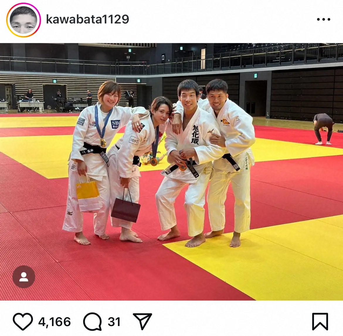 出口は8日、「雑誌の表紙みたいなウチら激アツじゃん?」とつづり、角田、川端、永瀬と肩を組んだ写真をアップ。「#みんなの身長に合わせるために腰じゃなく膝を曲げてくれる永瀬すぎる永瀬選手 #笑いの金メダル川端龍 #スタイル良すぎて同じ身長なのに2階級も違くてワイ困っちゃうよ角田夏実」とコメントした。