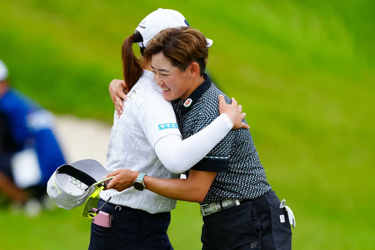 <ソニー日本女子プロ選手権3日目>18番、同組の竹田麗央(左)と健闘をたたえ合いホールアウトする岩井明愛(撮影・会津 智海)