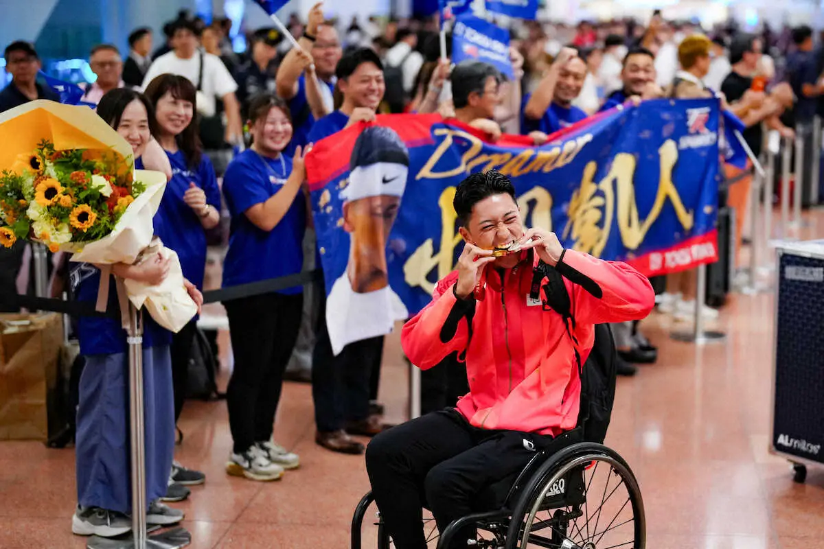 パリパラ金・小田凱人“凱旋”に10台超えるテレビカメラ、ファンが出迎え祝福 笑顔でメダルかむパフォも