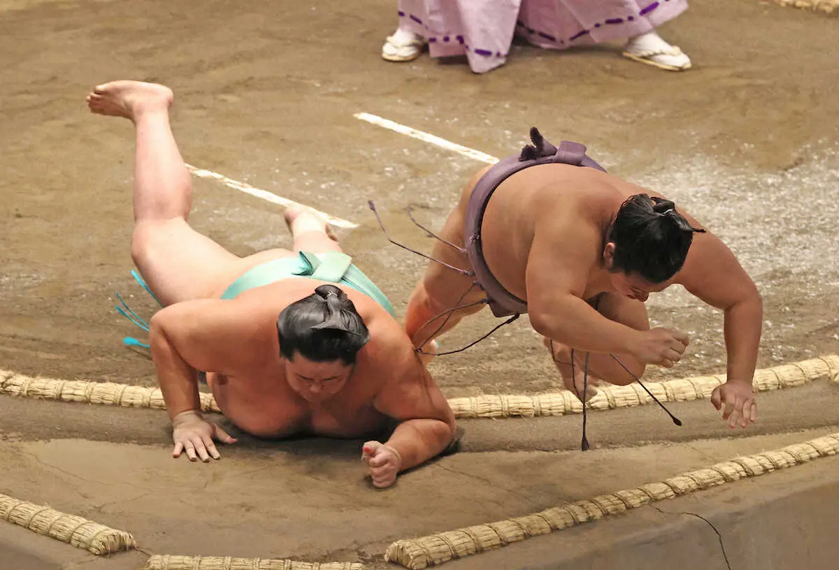 土俵下まで跳ね飛ばされた翔猿が落ちるのより先に、琴桜が両手をついたようにも見えたが軍配は琴桜。そのまま物言いはつかず、「軍配を見てないし、もつれたのも見えてなかった」。翔猿は「感覚的には負けてない」と不満げだったが、九重審判長(元大関・千代大海)は「(翔猿の体が)飛んじゃってた」と死に体との判定だった。