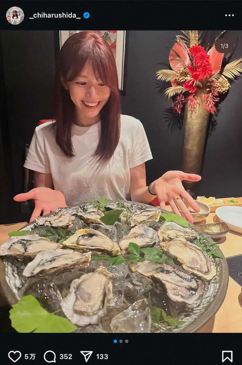 自身のインスタグラムで「実は、ちょっと前にずっと我慢していた念願の生ガキを食べました」と笑顔な志田の写真を投稿。