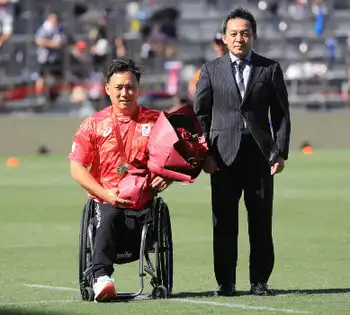 【日本代表】パラ金メダル車いすラグビーの池透暢主将が観戦 試合前日にスピーチ、立川と主将談義も