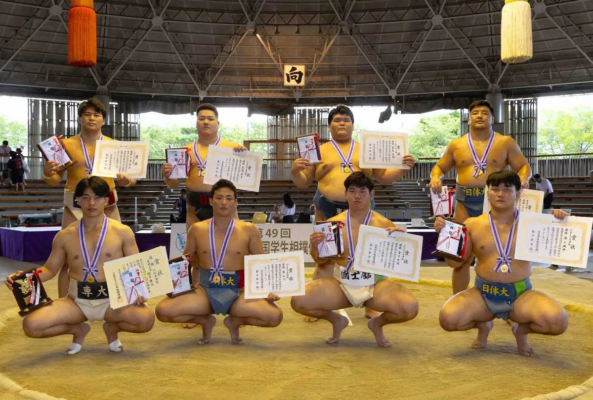 第49回全国学生相撲個人体重別選手権大会が14日、大阪・堺市大浜公園相撲場で行われた。当初は9月1日に開催予定だったが、台風の影響で延期となっていた。出場人数のバランスを考慮し、今年から階級区分が一部変更。最も軽い65キロ未満級が廃止され、125キロ未満級が新設された。東西の予選を勝ち抜いた各階級16人ずつが8階級で熱戦を繰り広げた。