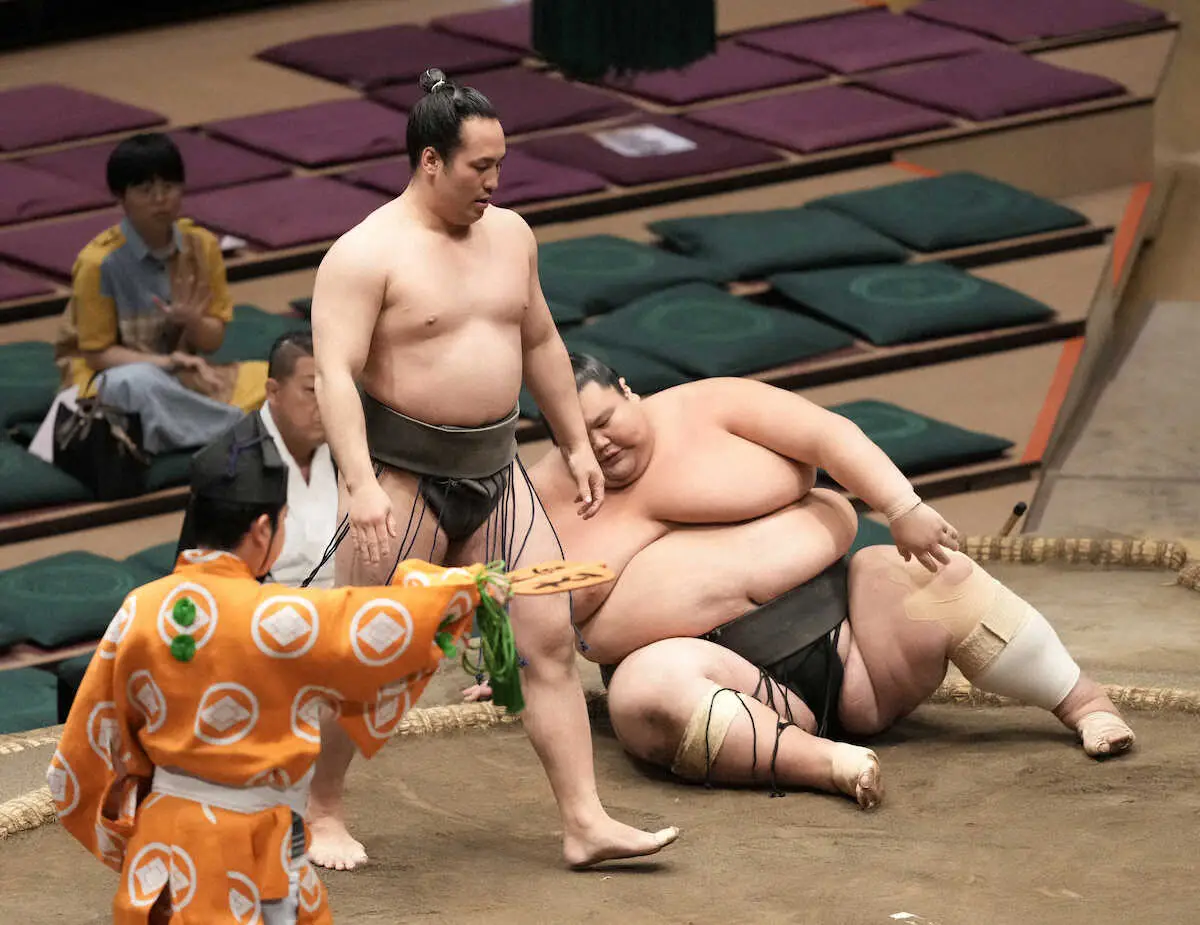 体重118キロの須山に対し、出羽ノ城は現役力士最重量の252キロ。須山は立ち合い左へ動いて腕を手繰りにいき、突っ張りで距離を取ってから潜って相手の太い左足を抱え上げて足取りで倒した。