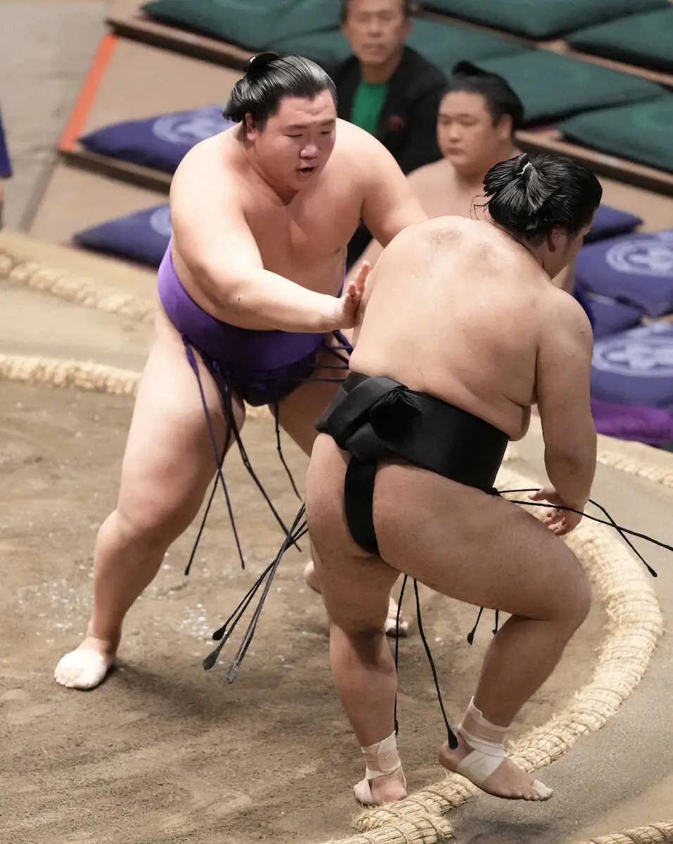 立ち合いから激しく突っ張って先手を取り、相手に前ミツを与えず一方的に押し出した。得意とする四つ相撲以外にも、長い腕を生かした突き押しの強さも披露。「思い切り当たって前に出られた」と会心の内容を振り返った。