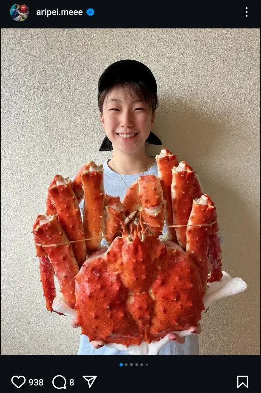 「in HOKKAIDO A crab bigger than me」とつづり、超ビッグなカニを抱えている写真などをアップ。ハッシュタグで「初めて食べたこんな大きいカニ」「自分より大きいカニ」「@kaisenzuihou_ いつもありがとうございます」などと添えた。