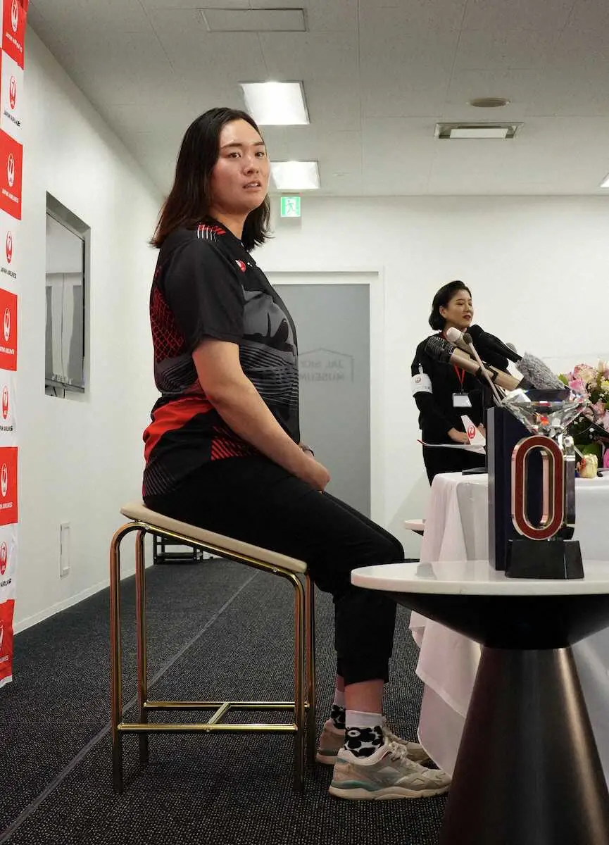 傾斜のある座面の椅子に座る北口榛花(撮影・小海途 良幹)