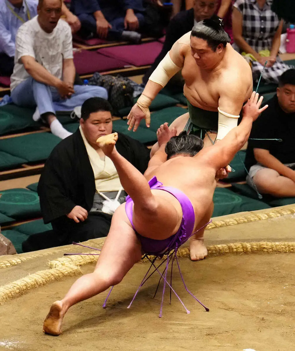 立ち合いもろ手突きで相手の上体をのけ反らせると、一気に前に出てくるところを左へ回り込んではたき込み。土俵際ギリギリで左足一本残り「どう考えてもあれしかない」と言い切る“必殺技”で全勝を止めた。「肩の筋肉とかヤバい(すごい)ので、もろ手であごを狙ってから引こうと」。一発必中の引き技に懸け「いけると思った」と狙い通りに決めた。