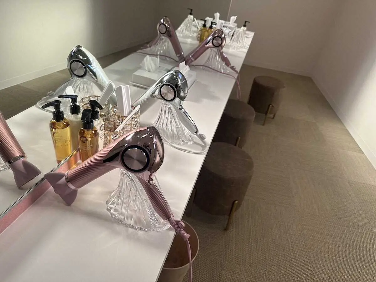 女性用の浴室にはReFaのシャワーヘッドも完備されている。約6種類のシャンプーとコンディショナーから自分の好きなものを選べるサービスもあり、紫外線を浴びた髪の毛のケアもバッチリだ。施設内はピンクを基調としたかわいらしい空間で、女性ゴルファーの皆さんに是非おすすめしたい。