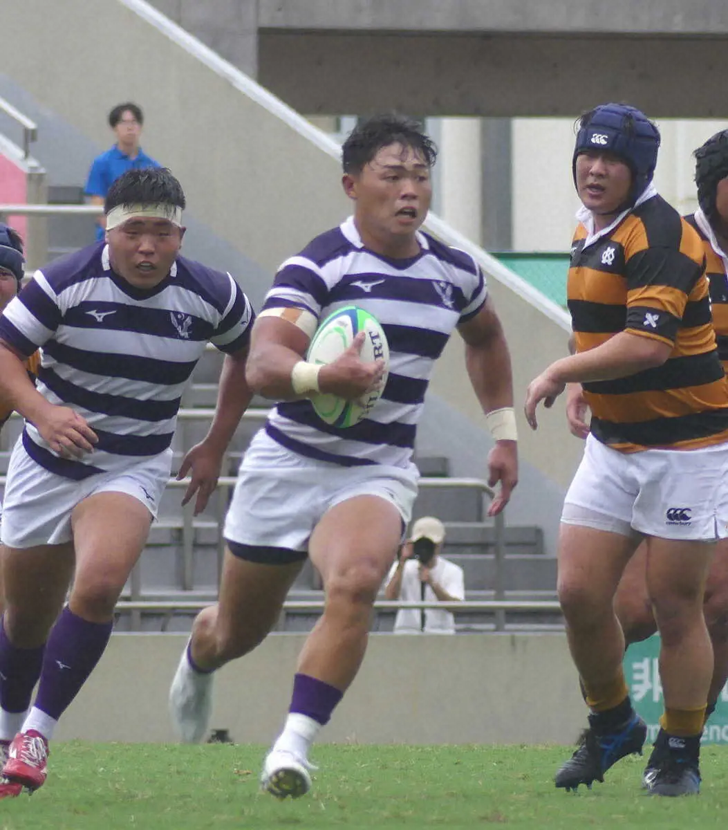 明大が慶大を52―7で下し2連勝を飾った。例年、11月に行われていた伝統の一戦。開幕2戦目で異例の早期激突となったが、明大が8トライを奪って圧倒した。