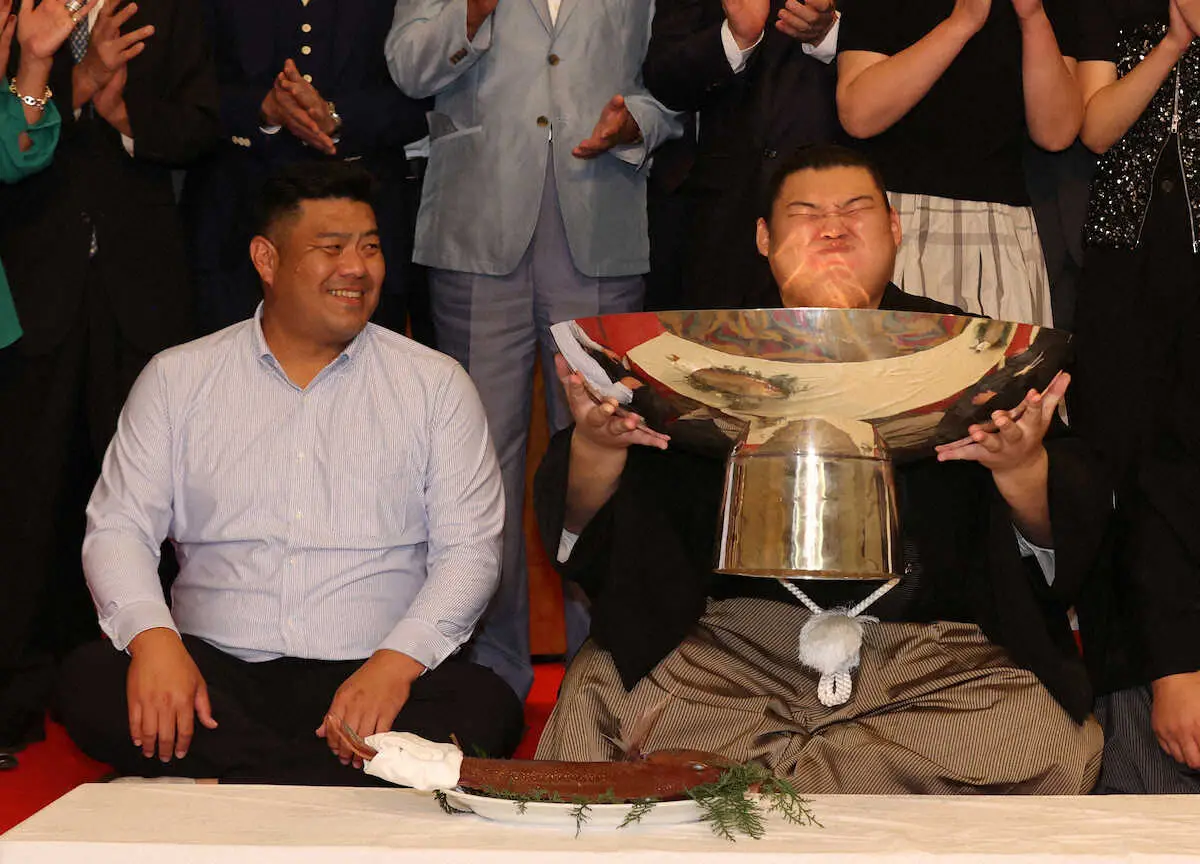 祝勝会で笑顔の父・中村知幸さん(左)と大の里(撮影・西海健太郎)