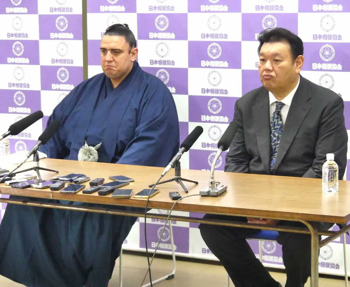 引退会見を行った碧山(左)と師匠の春日野親方