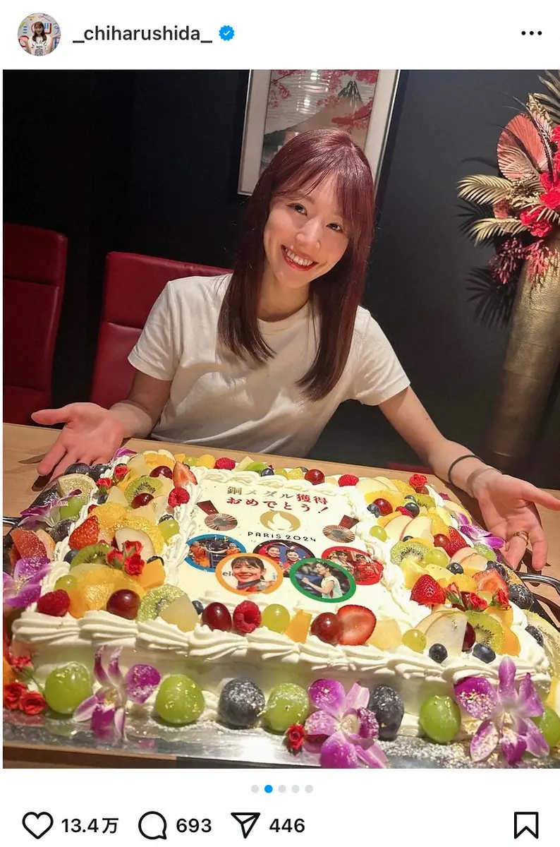 「銅メダル獲得おめでとう!」の文字に加え、五輪マークの中にはシダマツの写真などがプリントされた特注の超巨大ケーキの写真を投稿。「かなり時差投稿になりますが、、、家族とのディナーにて、たくさんのごちそうと、とてもかわいくて大きなケーキでお祝いしていただきました」と思い出を振り返った。