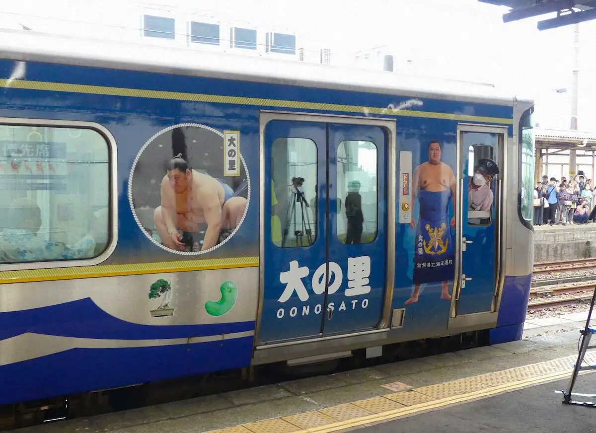 大相撲の新大関・大の里(24=二所ノ関部屋)が28日、中高6年間を過ごした“第二の故郷”新潟県糸魚川市で行われた「えちごトキめき鉄道」のラッピング車両お披露目セレモニーに出席した。幕内・白熊、十両・嘉陽、欧勝海も含む海洋高出身4関取が描かれたデザイン。母校の最寄りの能生(のう)駅まで乗車した大の里は「自分の写真が載った電車は不思議な感覚。でもうれしい」と笑顔を見せた。