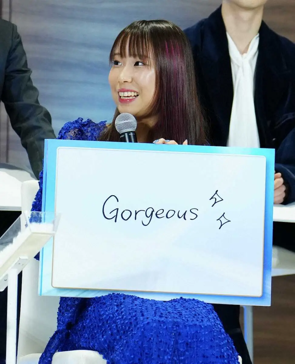 女子の三原舞依(シスメックス)は「今季、意識している選手」を問われると、ボードに「自分自身」と書き込んだ。