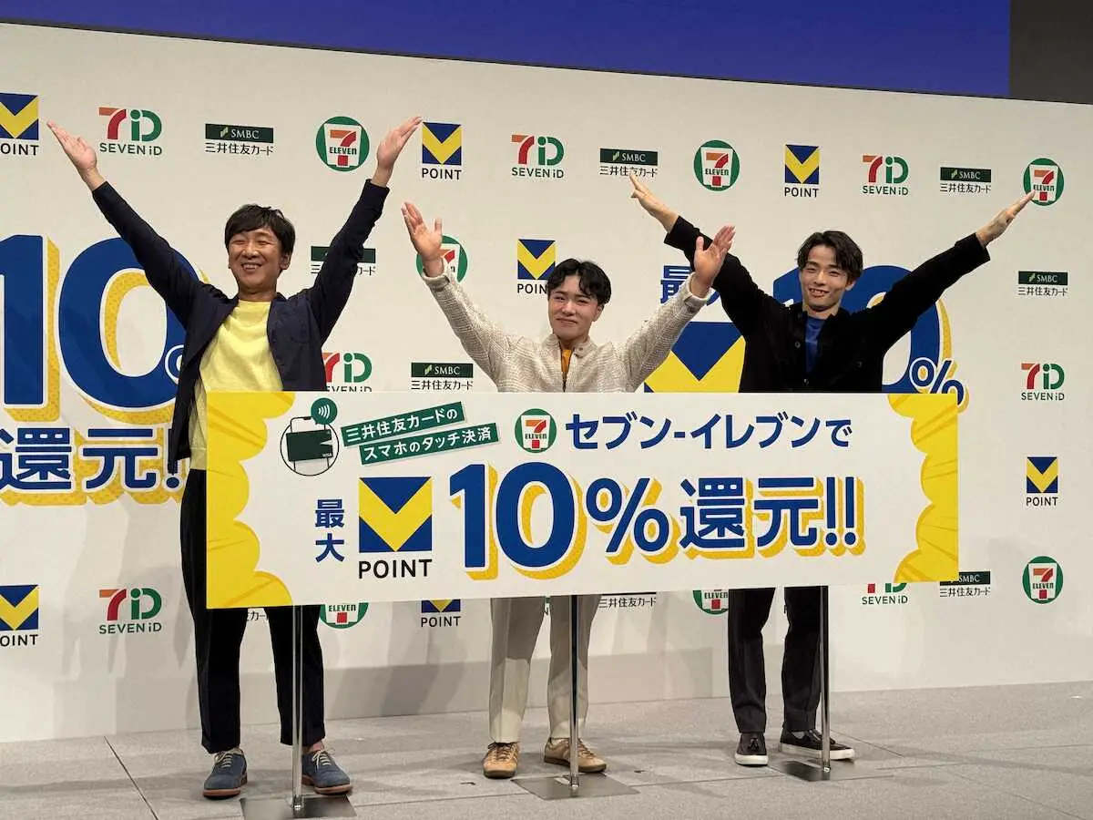 日本全国に2万1600店以上を展開するセブン―イレブンでは、これまで三井住友カードのスマホのタッチ決済を利用した際に最大7%のVポイントを還元していたが、15日からは一定の条件を満たした場合、最大10%が還元される。イベントに出席した岡、杉野、そしてお笑いトリオ東京03の飯塚悟志は、大幅な還元率アップに対し、一様に驚きと喜びの表情を浮かべた。