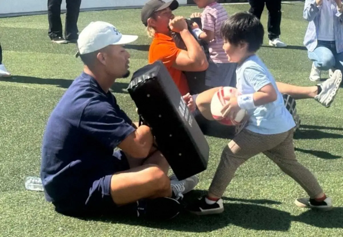 約1時間、パス練習やタックル体験などで触れ合った。15、19年W杯に日本代表として出場し、現役としてリーグワンでプレーする司令塔から指導してもらい、子供たちにとっては貴重な1時間。質問にも答え、記念撮影やサインにも応じた。