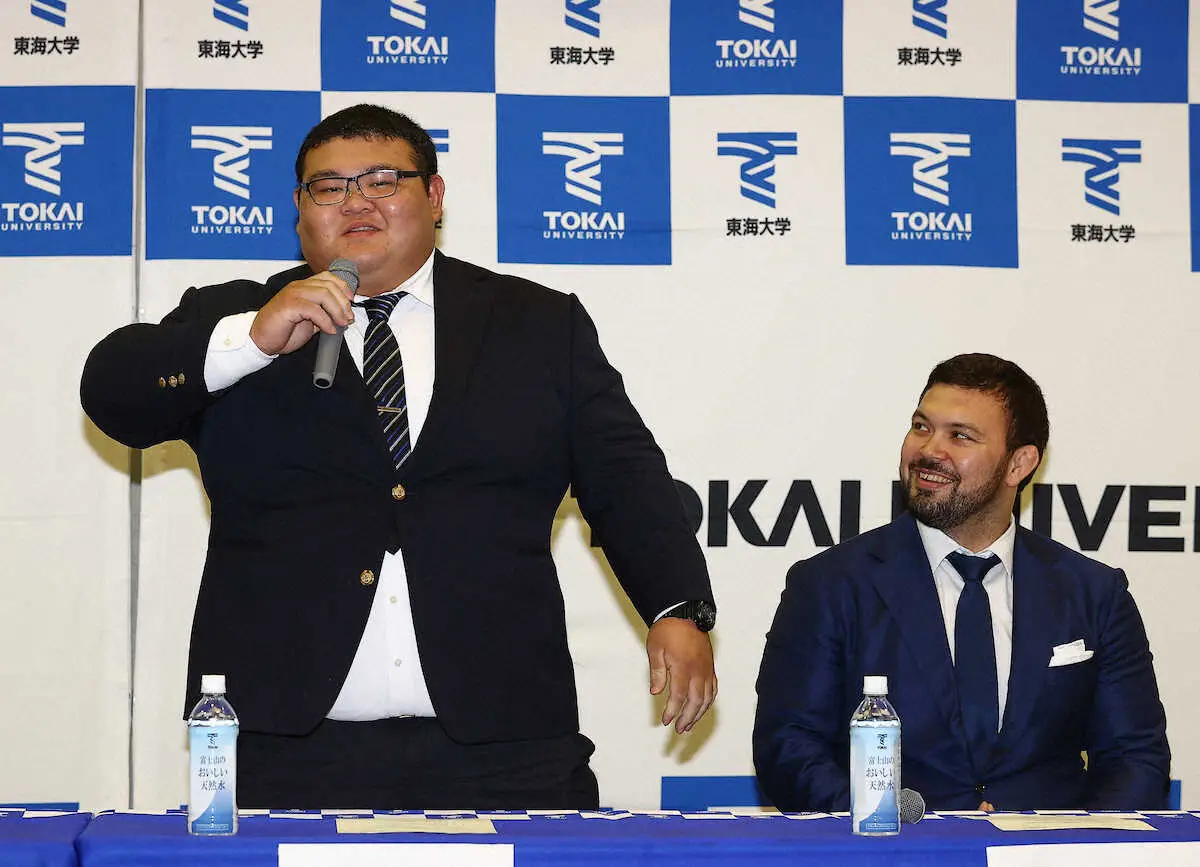 会見では座るとジャケットのボタンが外れるほどの太鼓腹の岡田は「高田川部屋に稽古に行かせてもらい、相撲の厳しさ、楽しさを柔道とは違いを肌で感じることができた。幕内を目指したい」と決意表明。師匠となる高田川親方(元関脇・安芸乃島)は「東海大柔道部は柔道の頂点。相撲は素人だが、ポテンシャルが高い。角界入りして柔道部の名を汚さないように頑張ってほしい」と期待する。